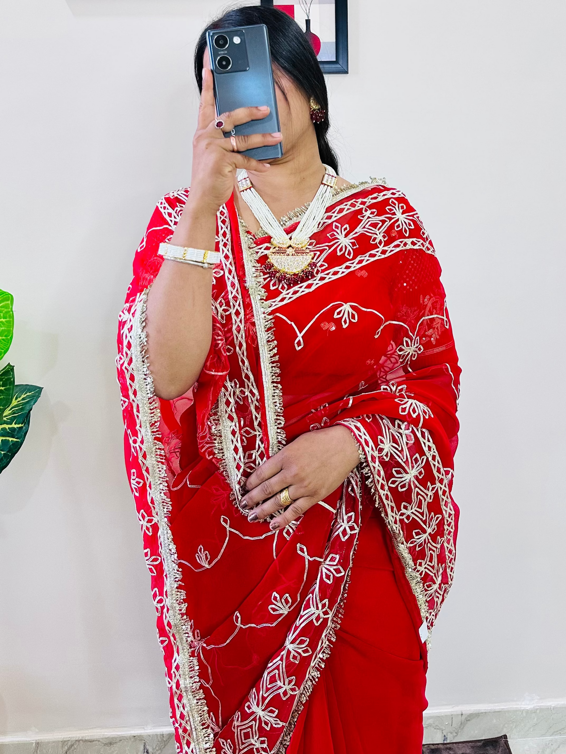 This elegant saree is crafted from premium quality georgette fabric and enhanced with pure gota patti work, giving it a rich and traditional look. Perfect for festive and special occasions.